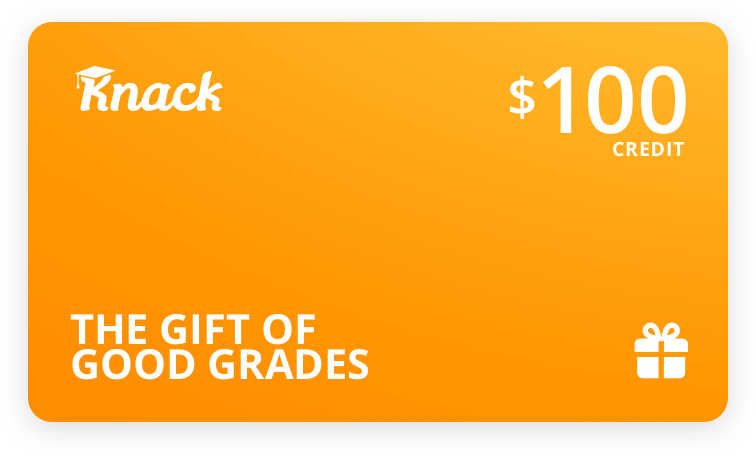 Give your son or daughter the gift of good grades with a Knack Gift Card. Gift Cards are preloaded with credit so your student can get the help they need, right away.